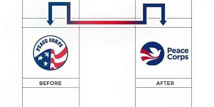 El viejo logotipo del Cuerpo de Paz de los EUA atrajo la atención con su esquema de color patriótico, pero no fluyó muy bien. El nuevo diseño tiene un mucho mejor flujo visual que crea la sensación de movimiento. Colocar la paloma en el punto focal central de una organización sin ánimo de lucro que busca ayudar y conseguir la paz entre personas de todo el mundo es también un tacto agradable y apropiado.